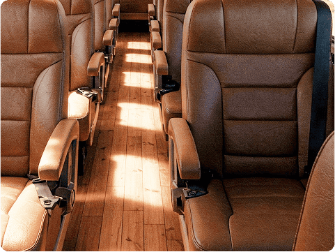 Luxuriate in our premium buses featuring rich leather seating and elegant wood flooring.